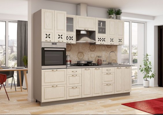 Хотите готовить и проводить время на кухне с удовольствием? Укомплектуйте помещение красивой и удобной мебелью — закажите гарнитур «Ампир»! Комплект эстетичен и функционален. В него входят все необходимые для создания идеальных условий элементы. Холодные оттенки поддерживают праздничное, романтическое настроение. Немного гламура в обстановку вносят прорезные орнаменты на дверцах подвесных шкафчиков.