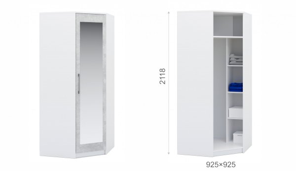 Угловой шкаф выполнен в стиле минимализм – строгие линии, идеальные пропорции, отсутствие декора. Все варианты цвета корпуса и фасадов подобраны в нейтральных сочетаниях, они универсальны для любого стиля интерьера, их можно сочетать со множеством ярких и насыщенных оттенков, а с помощью смены цветных текстиля и аксессуаров - полностью преображать пространство. Зеркало на фасаде визуально добавляет света и простора. Шкаф позволяет рационально использовать пространство и будет хорошо смотреться даже в небольшой комнате, служит связующим звеном для составления угловой системы хранения. Идеально компонуется со всеми модулями системы Аврора. Мебель выполнена из высококачественных материалов.