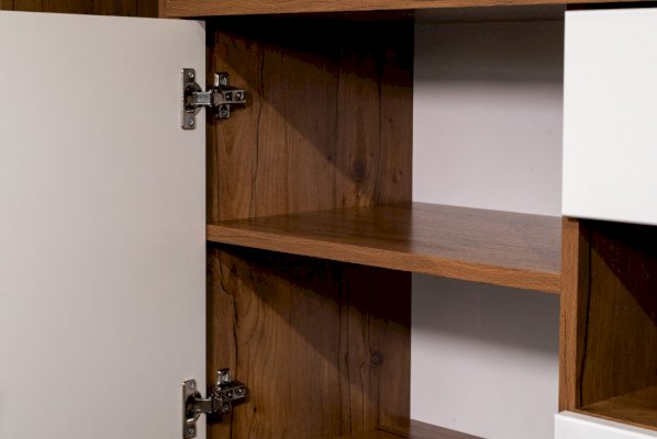 Интрига лежит в основе дизайна данного модуля. При первом взгляде кажется, что сверху находятся три выдвижных ящика и еще один - внизу, в центре. На самом деле выдвижных ящиков два – по центру – сверху и снизу. Ящики снабжены шариковыми направляющими, которые обеспечивают плавный ход выдвижения. Справа и слева расположены два отсека с распашными дверцами, за которыми скрываются по две полки из ЛДСП. Украшение и изюминка модуля – центральная открытая полка. Она как будто улыбается владельцу – открыто, приветливо и дружелюбно.
