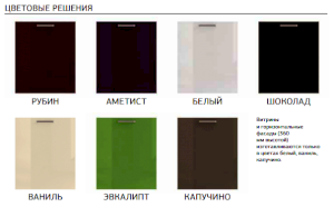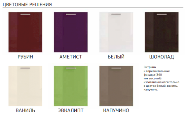 Каркасы: ЛДСП Глубина каркасов нижних шкафов - 510 мм, Глубина каркасов верхних шкафов - 320 мм. Цоколь ЛДСП - в комплекте с нижним шкафом, выдвижные ящики - метабоксы. Фасады: МДФ фрезерованная, окутанная глянцевой пленкой ПВХ. Цвета фасадов - белый, ванильный, аметист (фиолетовый), рубин (бордовый), шоколад, капучино, эвкалипт. Витрины - матовое стекло.