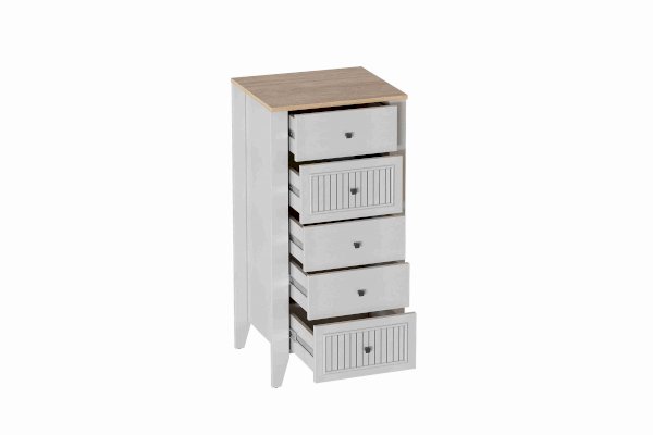 Комод с 5 ящиками Валенсия выполнен из ЛДСП в комбинации Дуб натуральный светлый / Персидский жемчуг.