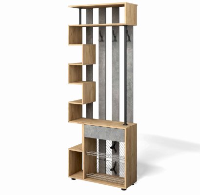 Этот оригинальный модуль прихожей Мини-лайт включает в себя сразу и полки под обувь, ящик для средства ухода за обувью, полочки для ключей и мелочевки, вешалку для одежды и антресольную полку под головные уборы.