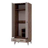 Двухстворчатый шкаф «Скандика» выполнен из качественной ЛДСП в оттенках дуб смоки/кашемир. Матовые фасады практичны в использовании. Модель состоит из нижнего выкатного ящика, двух распашных дверок, за которыми находится отделения с хромированной штангой, вместительная верхняя полка и встроенный блок с двумя дополнительными полками. Створки плотно фиксируются на магнитах.