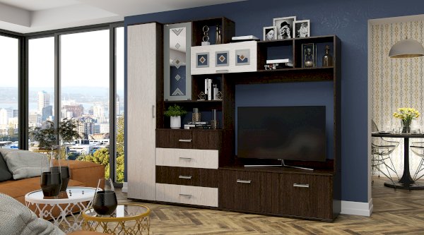 Модульная гостиная Белла - это функциональная стилизованная модель с простыми геометрическими формами. Особый шарм ей придаёт сочетание корпуса и фасада, а также отделка зеркалами бронзового оттенка с фьюзингом (художественные вставки из цветного стекла), пескоструйной обработкой и еврокромкой. Удобная зона для ТВ, вместительные выдвижные ящики, закрытые и открытые полки позволяют максимально эффективно использовать пространство.