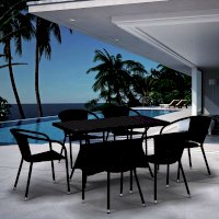 Легкую и воздушную обеденную группу на 6 персон можно разместить в доме, на даче, в беседке или под навесом. Не требует особого ухода, не подвержена разрушительному влиянию окружающей среды, влаги и солнца.