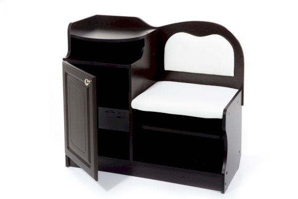 Банкетка выполнена в классическом стиле. Удобные полки и ящики добавляют ей функциональности.