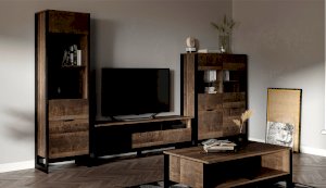 Шкаф-витрина со стеклянным фасадом – современное решение для гостиной или прихожей в стилях лофт, сканди, эко-минимализм. За стеклом размещены полки для предметов интерьера или красивой посуды. Нижние отделения с глухими фасадами служат для хранения личных вещей. Отсутствие лицевой фурнитуры подчеркивает минимализм и геометрию модуля. Особенность дизайна – это сочетание реалистичных по цвету и тактильности трендовых декоров, которые соответствуют последним городским тенденциям. «Дуб Гранж» привлекает имитацией вручную обработанного дерева и выразительной зернистой текстурой, характерной формой досок. Стильный серый цвет «Железного камня» с металлическими разводами и новая текстура состаренной штукатурки в сочетании с гладкостью металла вносят индустриальный колорит. Оригинальные ножки-опоры из МДФ контрастного цвета придают изюминку, а светодиодная подсветка усилит впечатление от созданного интерьера.