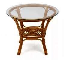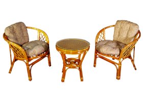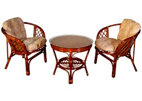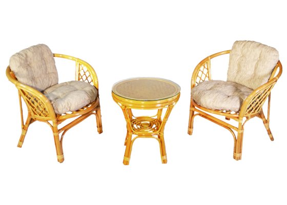 Комплект из натурального ротанга, состоящий из двух кресел и круглого столика с плетеной столешницей. Стекло входит в комплект.