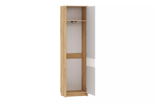 Шкаф оснащен выдвижной штангой, на которую удобно повесить верхнюю одежду на вешалках, а также отдельной полкой для размещения головных уборов и прочих вещей. Шкаф может быть собран как на правую, так и на левую стороны. Дополните шкаф тумбой и зеркалом из одноименной коллекции, чтобы оптимизировать место хранения в прихожей и создать особо гармоничную атмосферу!