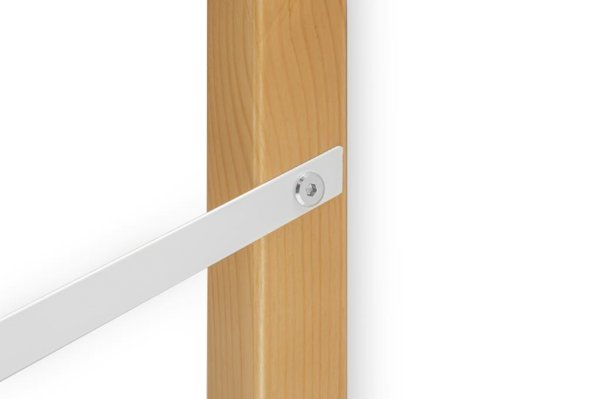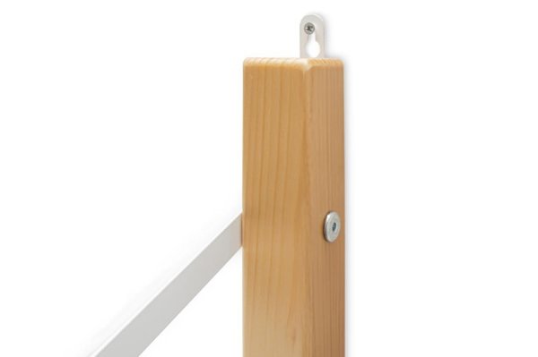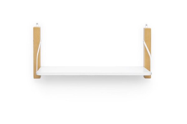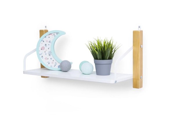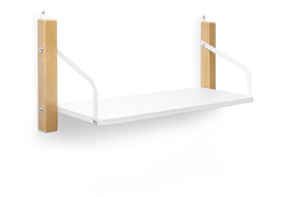 Полка изготавливается из массива сосны, покрытого эмалью/лаком на водной основе, и из ЛДСП. Полкодержатели металлические, покрыты порошковой краской.