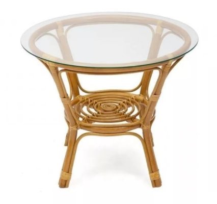 Комплект из натурального ротанга, состоящий из дивана, двух кресел и круглого столика со стеклом.