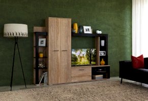 Гостиная Торонто - оригинальный дизайн, вместительность и небольшие габариты. Занимая мало места по глубине и ширине, она включает в себя платяной шкаф с штангой, нишу под ТВ и множество полок для приставок, колонок, книг и декора. Использование популярных цветов Дуб сонома и венге даёт возможность легко сочетать эту стенку в гостиной с другими предметами мебели – столами, журнальными столиками, стеллажами или комодами. Выполнена из экологичных материалов.