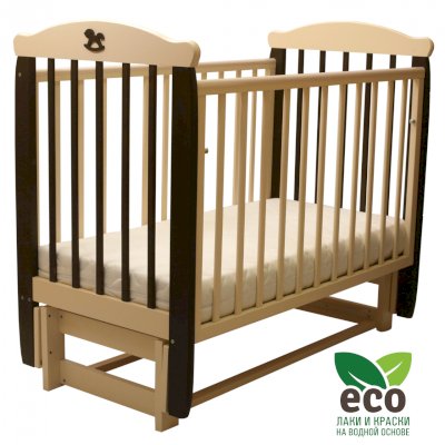 Кроватка "Соня 05" имеет механизм качания продольный маятник. Механизм качания фиксируется. Возможен вариант кровати с ящиком.